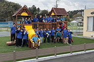 児童養護施設「びっき」にてプレイセットを新設後、完成したセットの前で集合するチームメンバー