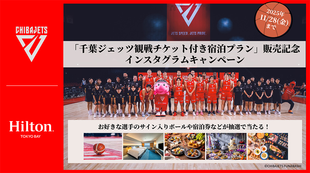 | 賞品 | ・ヒルトン東京ベイ デラックスルーム宿泊券 1泊朝食付 1組2名様 ・Bリーグ公式バスケットボール (お好きな選手のサイン入り) 1名様 ・千葉ジェッツ オーセンティックユニフォーム(富樫勇樹選手のサイン入り) 1名様 ・ヒルトン東京ベイ「ラウンジ・オー」でのスイーツビュッフェペア招待券 1組2名様 ・ヒルトン東京ベイ中国料理「王朝」でのチャイニーズアフタヌーンティーペア招待券 1組2名様 ・ヒルトン東京ベイバーラウンジ「シルバ」でのアフタヌーンティーペア招待券 1組2名様 ・ヒルトン東京ベイビュッフェレストラン「フォレストガーデン」でのランチビュッフェペア招待券 1組2名様 |