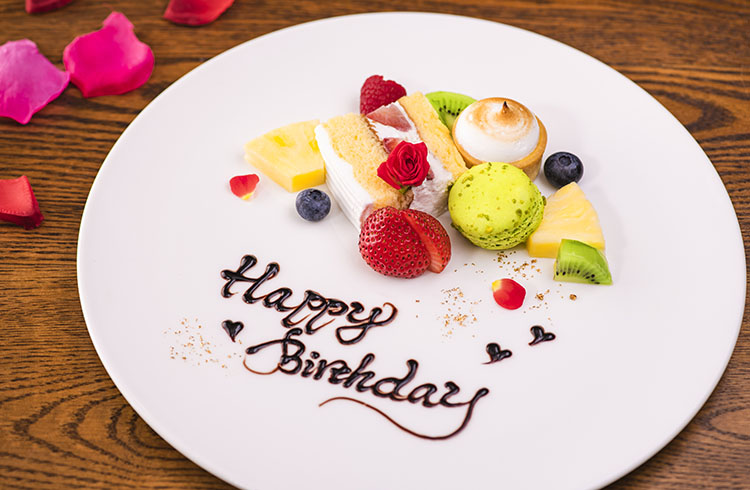 ケーキや焼き菓子などのミニデザートと、フルーツを華やかに盛り合わせたデザートプレートに、ご希望のメッセージを添えて提供いたします。