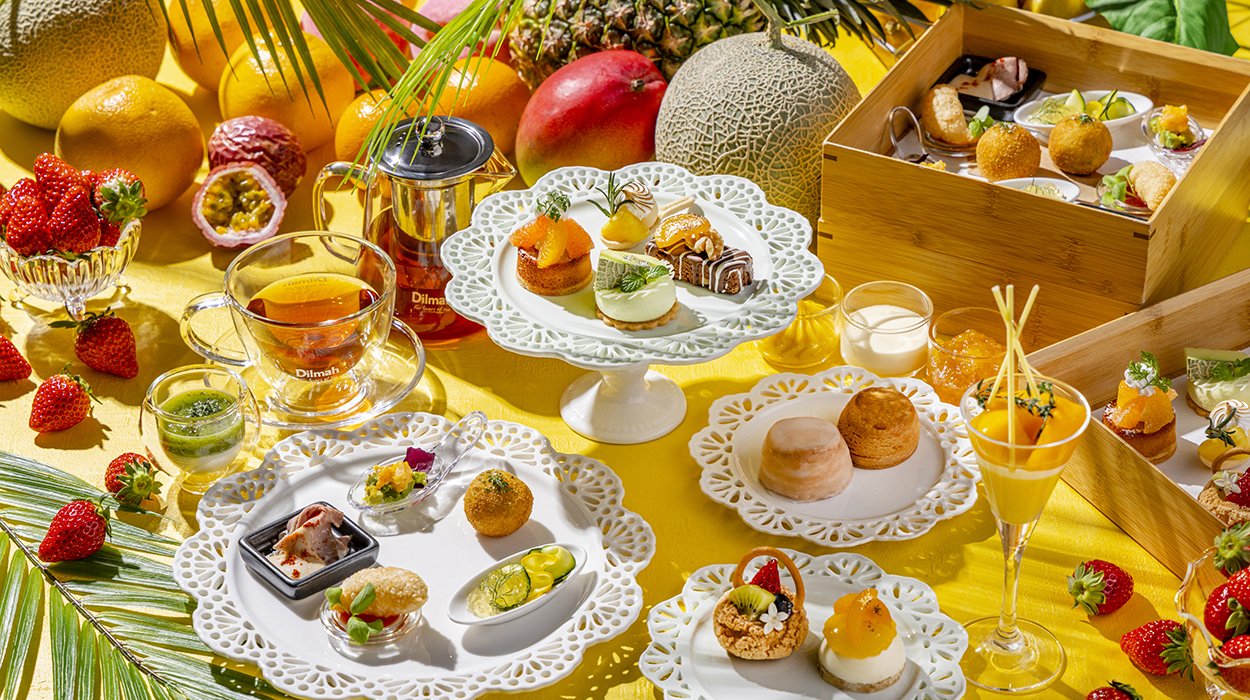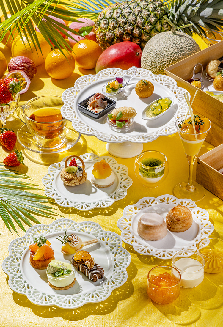 マンゴーやメロンなどの人気フルーツに加え、枇杷(びわ)など13種類のフルーツを使用したメニューが揃います。マンゴーとココナッツの2層のプリン上に完熟マンゴーを飾った贅沢なパフェや、メロンの網目を模したホワイトチョコとアールスメロンを飾ったメロンとバニラのムース、芳醇な枇杷(びわ)を飾ったレアチーズケーキなど、こだわりが詰まった7種がラインナップ。セイボリーでは、旬のズッキーニをかつお節ベースの和だしジュレで味わうカルパッチョ、磯の香りとタケノコの食感が楽しいアランチーニなど、初夏の息吹を感じる6皿をご用意いたしました。