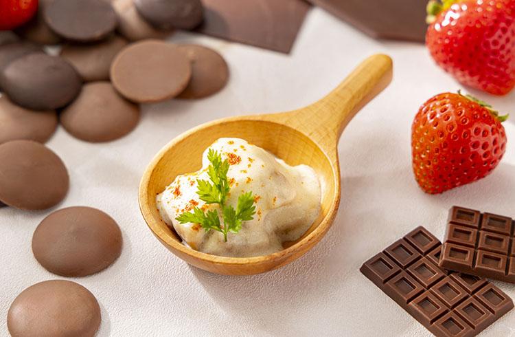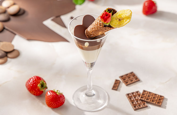 バニラパンナコッタと濃厚なチョコレートムースを2層に重ねたグラスデザートです。コーンの中にはチョコバナナガナッシュを忍ばせ、コーンにはベルローズをあしらい、バレンタインに贈る優美な薔薇の花束を表現しました。