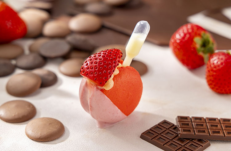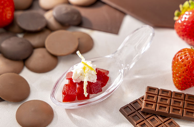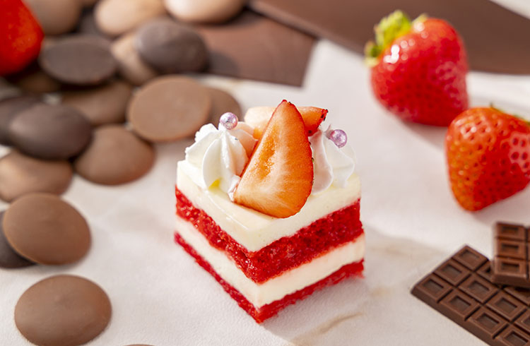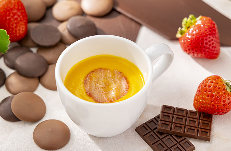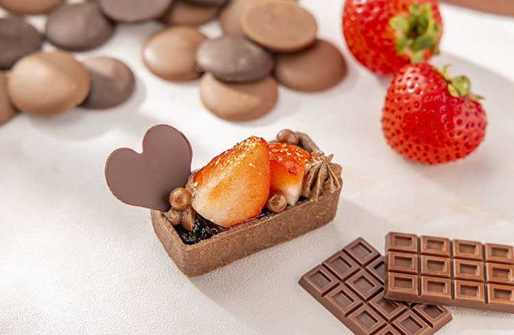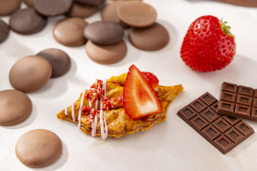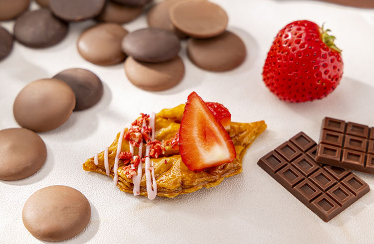 キャラメリゼしたリーフ型のパイに苺とストロベリーチョコレートをあしらい、苺の甘酸っぱさをプラスしました。サクサクとした軽やかな食感と香ばしいキャラメルの香りが心地よく広がります。