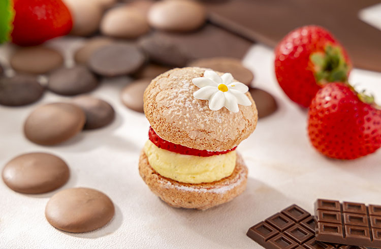 苺クリームをサンドしたマカロンにスポイト入りの練乳を添えました。お好みで練乳を加えることで、苺の酸味とまろやかな甘さが溶け合い、まるで苺ミルクのような味わいに。
