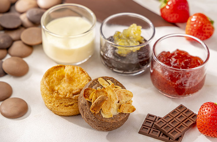定番のプレーンスコーンに加え、キャラメリゼしたアーモンドスライスをトッピングした、まるでフロランタンのような食感のアーモンドキャラメルスコーンをご用意しました。なめらかなクロテッドクリーム、苺とバルサミコ酢を合わせた芳醇なジャム、そして日向夏と濃厚なチョコレートを組み合わせたチョコレートクリームを添えて、お好みの組み合わせでお楽しみください。