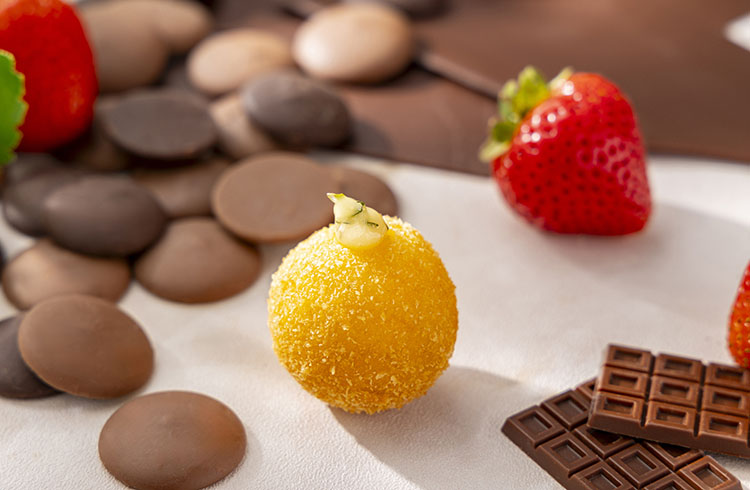 牛乳と生クリームで炊き上げ、もっちりとした食感に仕上げた黒米と、なめらかな生チョコレートを合わせた濃厚なタルトです。あえて芯を残した黒米の独特の歯ごたえが、濃厚なガナッシュの絶妙なアクセントに。トッピングの苺の甘酸っぱさが、ショコラの奥深い味わいと調和した一品です。