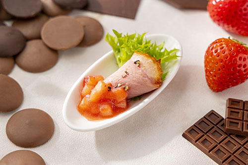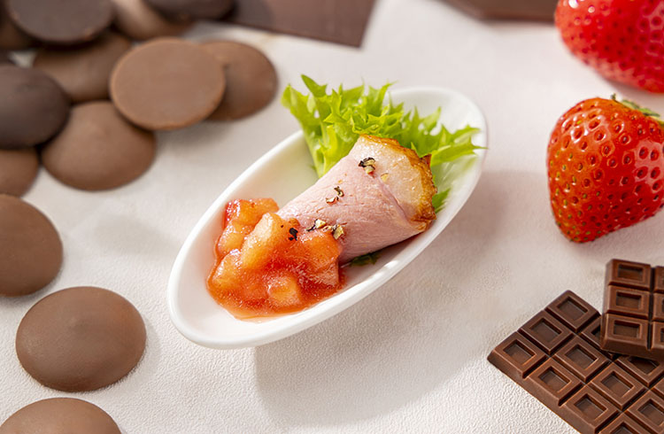 苺ピューレに赤ワインビネガーとオリーブオイルを合わせた芳醇な自家製のソースで味わう、スモークダック。セイボリーにも苺の魅力を感じていただけるよう味わいと香りのバランスにこだわりました。