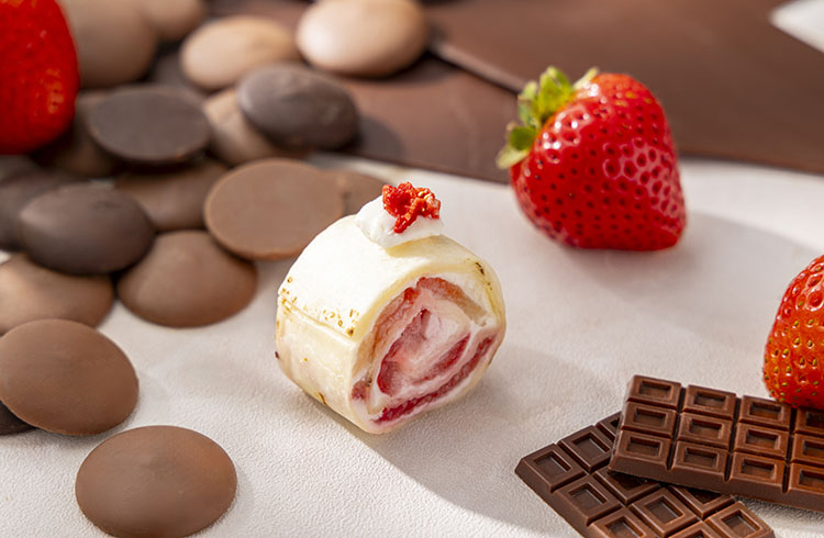 ダージリンとホワイトチョコレートのクリームを苺のスポンジ生地でふんわりと巻き上げたロールケーキ。苺の酸味、ホワイトチョコレートのまろやかな甘さ、そして芳醇な紅茶の香りがひと口ごとに広がります。