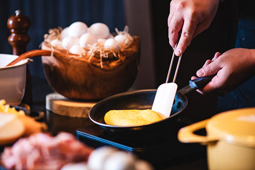 シェフが目の前で作るエッグステーションのおすすめは、アツアツのオムレツ。お好みに合わせて、チーズやハムなどのトッピングをお選びいただけます。また、ピーナッツバターやハムチーズから選べるオムレツブレッドやスクランブルエッグ、ゆで卵、ポーチドエッグなど、その日の気分でお選びください。