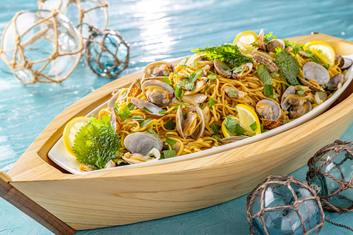 昭和初期の浦安は、海苔の養殖やあさり漁などが盛んな漁師町として栄えていました。当時、海苔採りに使っていた小さな漁船「べか舟」にちなんで、浦安商工会議所青年部によって名づけられたメニューです。浦安とゆかりの深いうま味たっぷりのあさりに加え、大葉やバター、レモンで仕上げた爽やかな味わいの焼きそばです。一日のはじまりに、旅先ならではのご当地グルメをお楽しみください。