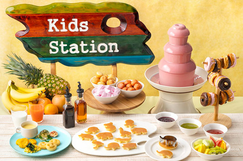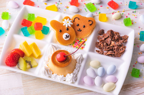 ライオンやワニなどの好きな動物の型抜きでくり抜き、自由に飾りつけして仕上げるパンケーキが登場。ポテトやナゲット、フルーツゼリーなど、お子様連れにおすすめメニューを多数取り揃えています。