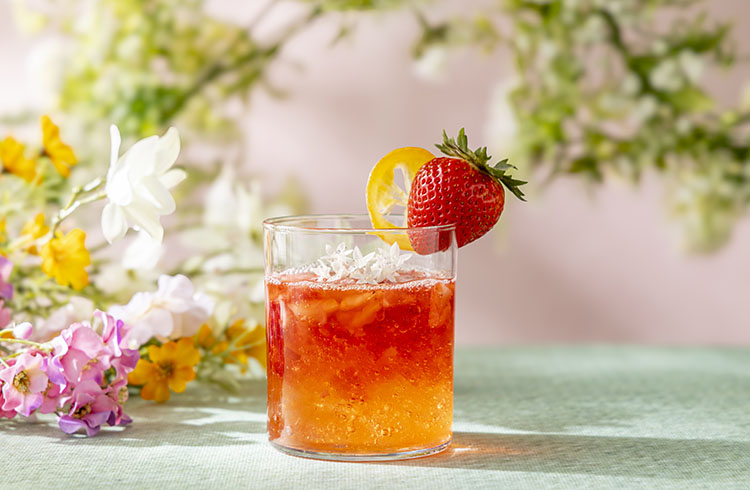 グラスの底に敷き詰めたのは、クラッシュしたローズと苺のゼリー。そこに潰した苺の果実とシロップを重ね、アセロラジュースを注いだ、爽やかな酸味が広がるドリンクです。口に広がる苺の果肉の食感もお楽しみいただけるよう、潰した状態でご用意しました。トップには、純白のエディブルフラワーをあしらい、妖精の魔法の粉をイメージした銀粉をふんわりと。さらに苺とドライレモンを飾り、見た目にも華やかな一杯に仕上げました。春の訪れを感じさせる、可憐で幻想的なドリンクをぜひご堪能ください。