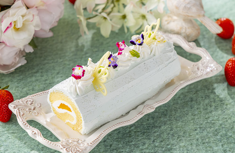 メロンの生クリームとメロンカスタードを巻き上げたロールケーキ。淡い色合いで、妖精の家をモチーフにしたファンタジックな世界観を表現しました。