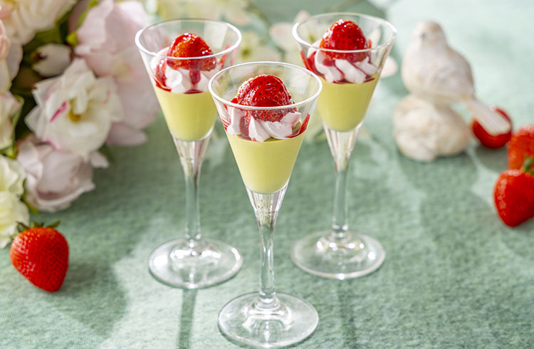 グラスに口どけなめらかなピスタチオのババロアを流し、ストロベリークリームを絞りました。仕上げにフレッシュな苺とラズベリーソースを添えて、ほんのりと酸味をプラスしています。
