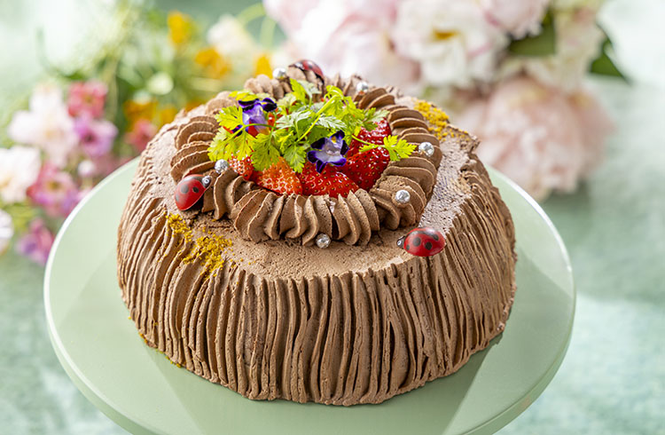 ふわふわの苺生地に苺クリームをまとわせ、たっぷりのベリーをあしらいました。ガーデンをイメージして緑色を添え、上品なデザインに仕上げました。