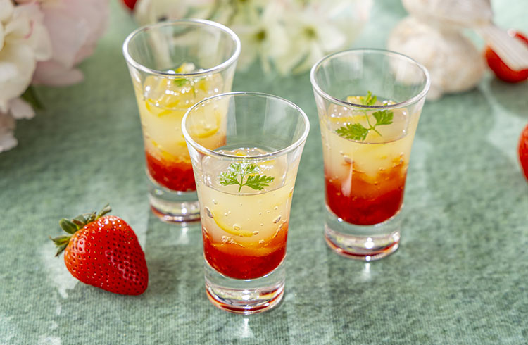 柚子のゼリーに苺のソースを合わせた一品。柚子の果皮を加えることで、ほのかな苦みと爽やかな香りが広がるゼリーは、苺のソースとの相性も抜群です。