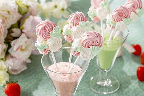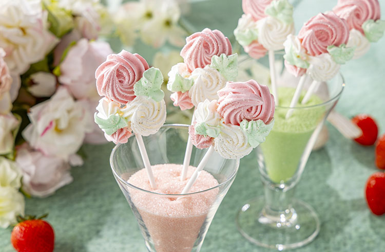 お花の上を妖精が通り過ぎたあとの、きらめきをイメージしたメレンゲ。 やさしいピーチ味とふんわりと甘さが広がる、フォトプロップスとしても華を添える一品です。