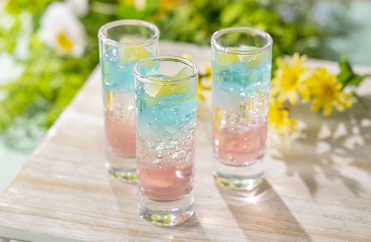 苺、レモン、ブルーハワイの3色が美しく重なる、神秘的なグラデーションゼリー。 中央のレモンゼリーにはナタデココを忍ばせ、トップにはりんごのコンポートを添えた、見た目も味わいも爽やかな一品です。
