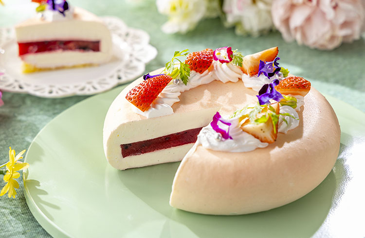 バニラムースにミックスベリー入りのジュレを挟んだ、華やかなスイーツ。 苺とエディブルフラワーをあしらい、花冠のような優美なデザインに仕上げました。